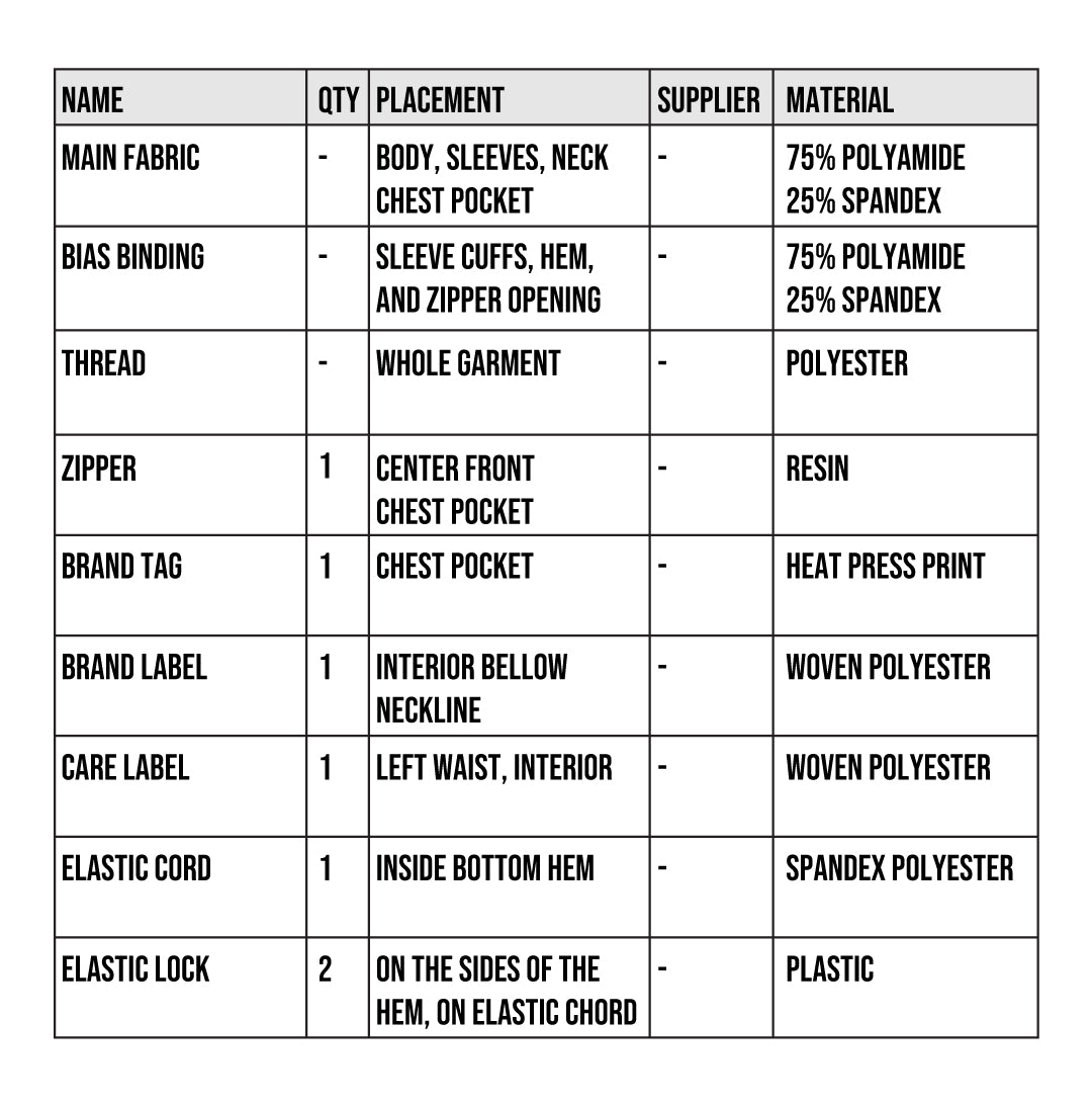 MAIN FABRIC : BODY, SLEEVES, NECK, CHEST POCKET